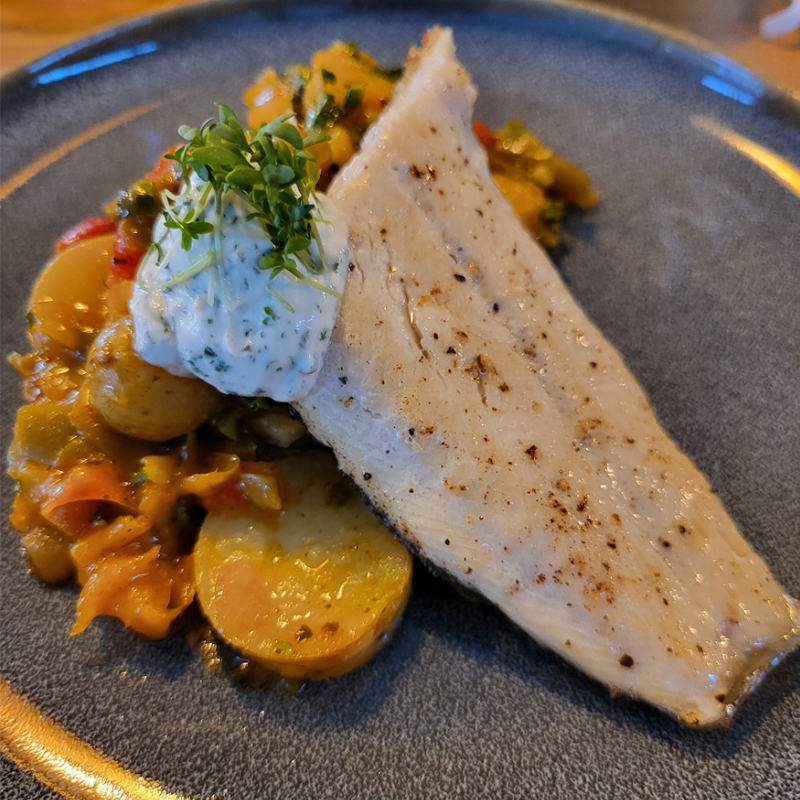 Heimischer Saibling │ geräucherter Paprika – Kartoffelsalat